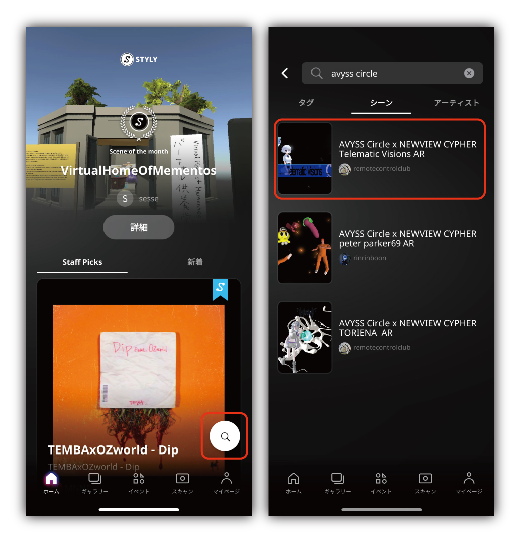 STYLYアプリを立ち上げて検索ボタンをクリック、「avyss circle」で検索