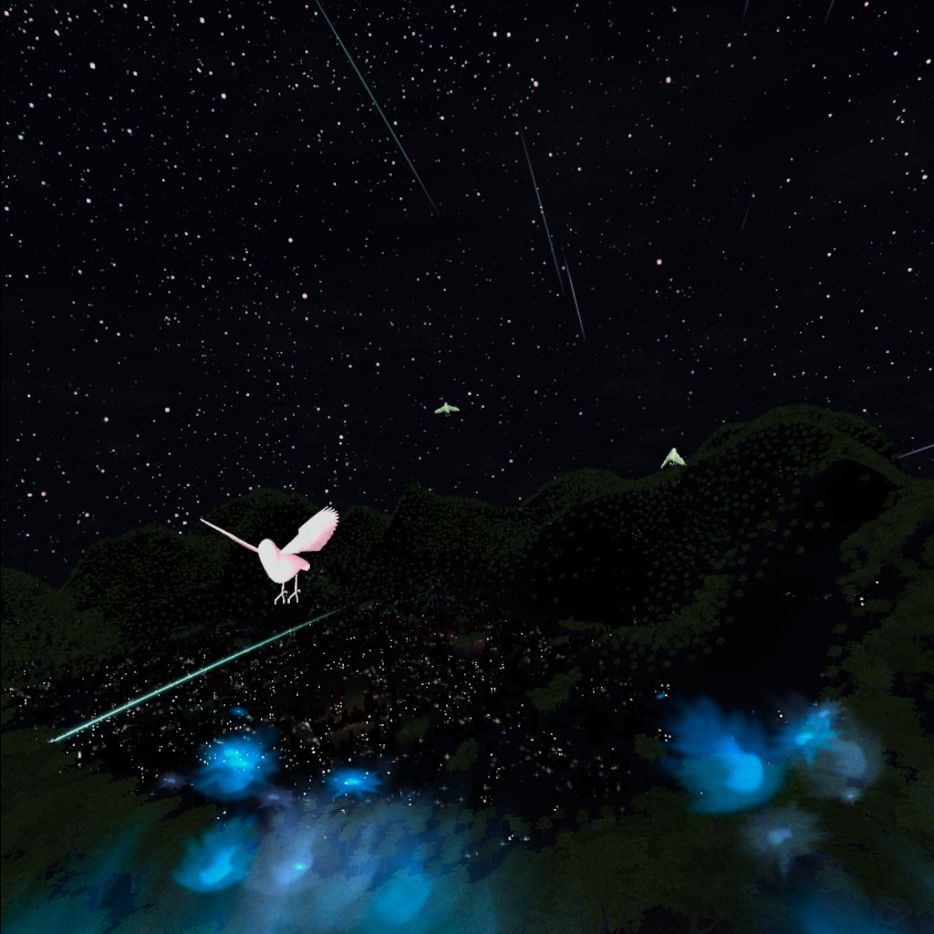 Riding on the back of a phoenix, you fly through the air. The presence of the experiencer is essential for calling fellow birds and collecting lights and sounds. Each time you call your friends with the controller, the sky you are flying in becomes your scenery, and each time you operate the controller, you will hear various sounds. The poetic view of the world, where scenery is created only when you participate in the story of birds, light, and sound, warmed my heart.