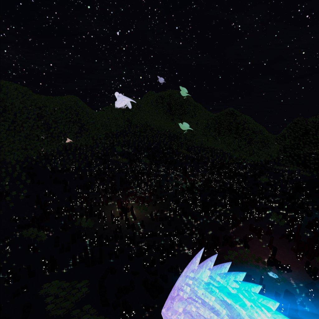 This time, I used Generative Art many times to create sceneries in this work. I used birds, cityscape and the starry sky with multiple programming languages.