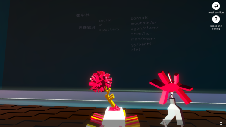 There is a world in a small pottery. It is a world, where everything is exist and is a utopia, is called Ko chuu Ten(heaven in a pottery). The Chinese legends tells so. This thought made Asian culture, Bonsai, mimic universe using small trees and grasses. For me it sounds like a VR. so I created bonsais in VR world and mimic our social situation. Please use your body to immerse this exhibition like you are in a Japanese teahouse. And look up!