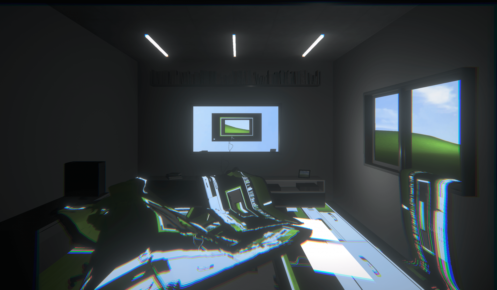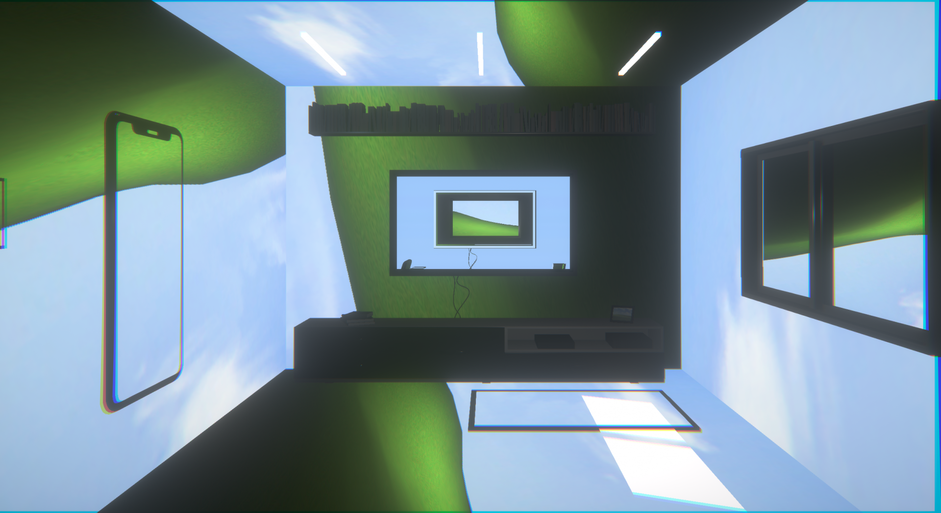 With a head-mounted display, spatial constraints are sensorially removed as they cover almost the entire field of view and can display the apparent three-dimensional images. On the other hand, the images which the general display shows are flat and are defined by size and distance in many cases. In this work, using the gap as a steppingstone, experimental expressions which took advantage of the symbolism were tried in various ways by daring to deal with the motif of display. We usually interact with the display as if it were a window to another world. XR technology can mix reality and unreality, however, there is a difference from looking in the window of a display.