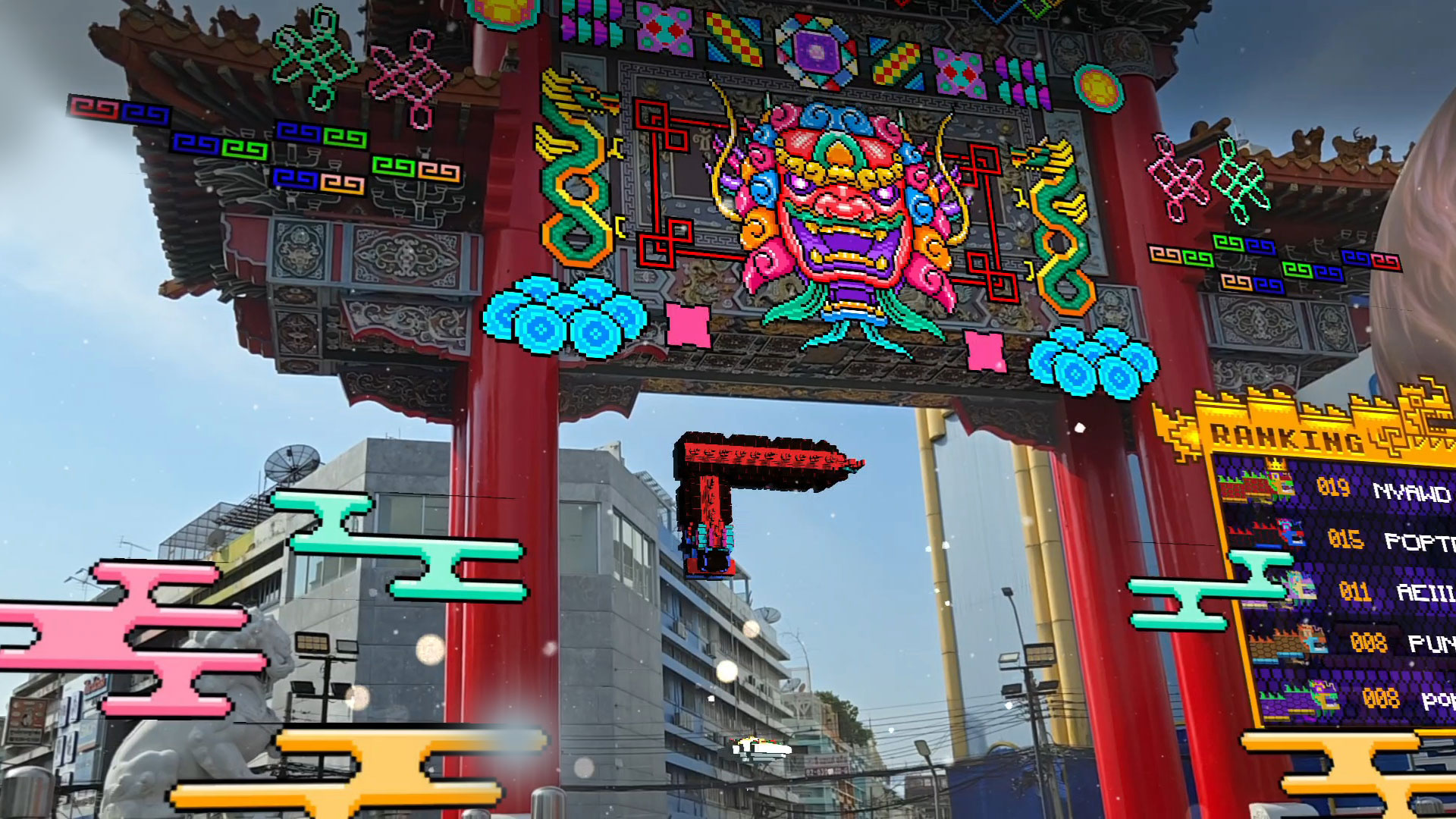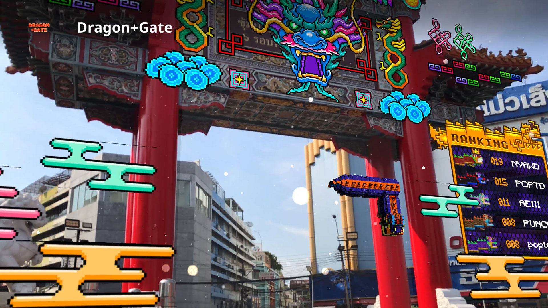 DRAGON + GATE project reimagines the classic snake game through augmented reality (AR), celebrating the Year of the Snake. Set in the culturally rich Odeon Circle, this interactive experience weaves themes of prosperity and fortune, with the snake consuming symbolic elements like money, work, and love. It aims to bridge generational divides by offering simple, accessible gameplay that appeals to both young and older audiences. By combining art, technology, and multiplayer systems, "DRAGON + GATE" not only revitalizes urban spaces but also fosters community engagement and social interaction, enhancing both the cultural and experiential value of the location. This bold reinterpretation of a classic game transforms Odeon Circle into a vibrant community hub, encouraging intergenerational engagement and pushing the boundaries of traditional gaming. Poptoday x BKKBROS. decided to bring the nostalgia fun into the real world using voxel art, a modern 3D pixel art technique. To achieve this, he invited BKK BROS., renowned for his expertise in modern pixel art, to collaborate. Together, they aimed to elevate the project by transforming it from 2D to 3D and adding vibrant, dynamic visuals, creating a next-level interactive experience.