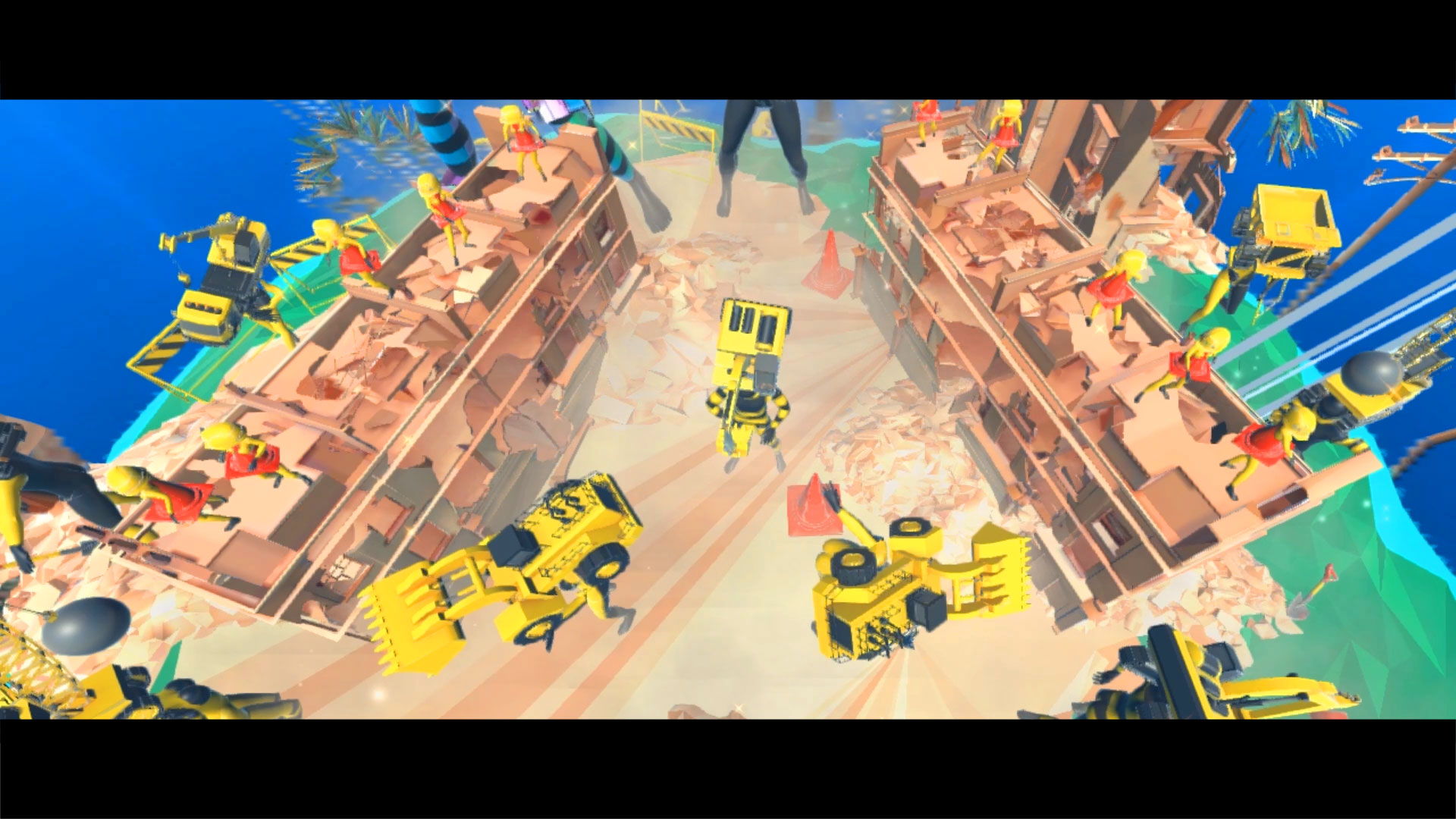 Construction machines perform a break dance in a virtual island. What will it be to create, to destroy, to live? What do you think?