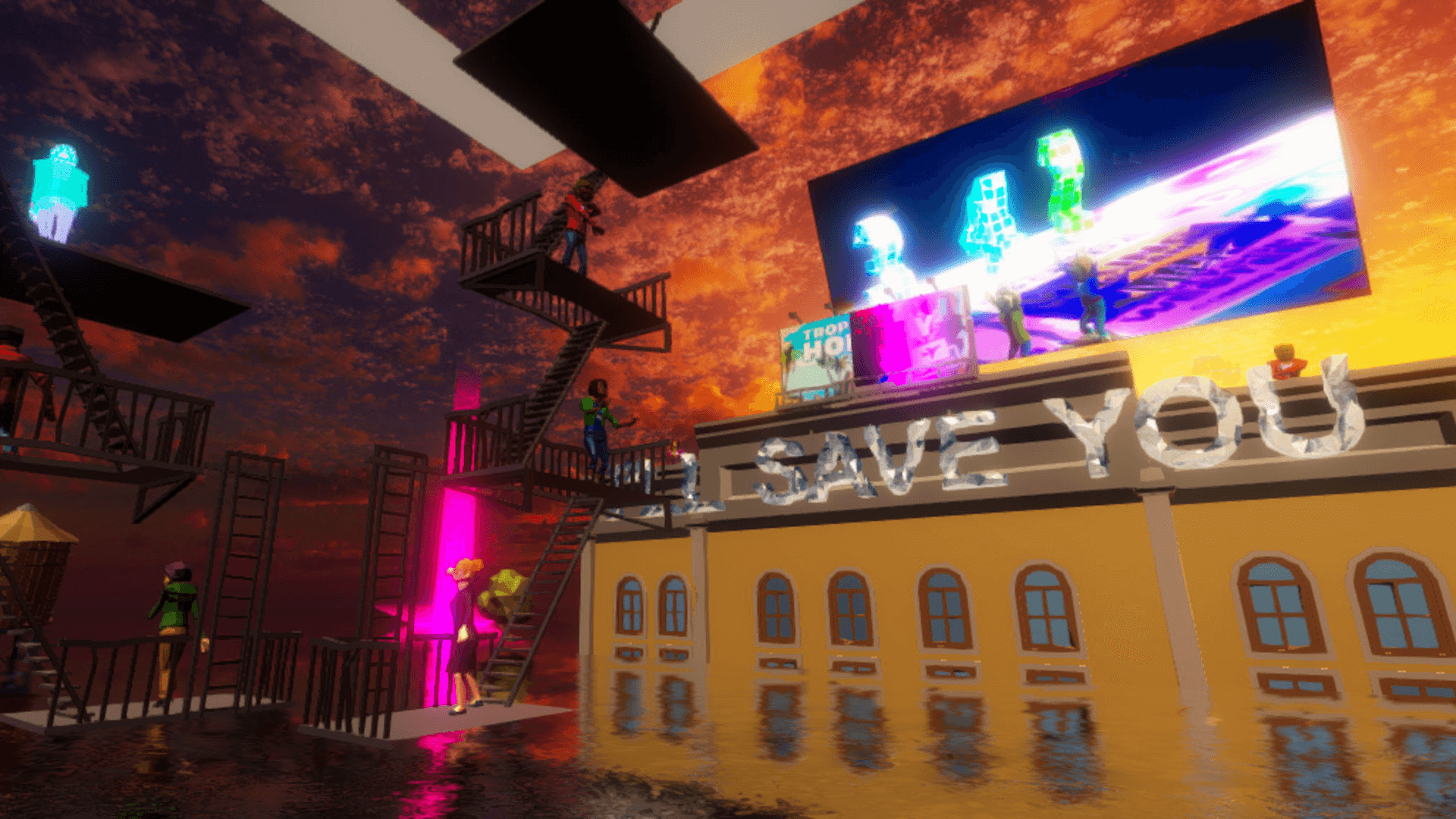 The work aims at defining the culture made in the virtual world as "Dystopia culture", and the experience of "Enthusiasm" that is created from Dysopia culture. It creates "Enthusiasm" by placing exciting items in various places, such as, people who feverishly continue to dance, signboards that flicker on and off, and displays that float in the air. Further, it expresses the feeling of Dystopia with things like crowds of police that swarm the air and sea, and announcers making appeals to safety that flow like background music. For we who live modern society full of fiction, I aimed to create a work that would give a kind of awareness.