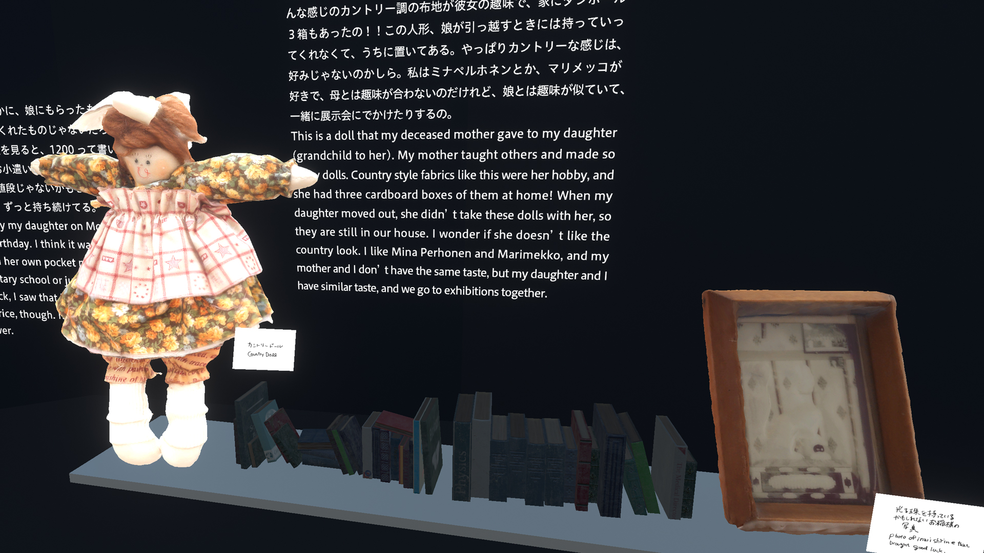 In the modern age, filter bubbles and echo chambers have been created, and people are avoiding getting involved with others who have a different way of thinking and revealing their memories and feelings. In addition, in Japanese society, the vestiges of the "family system," such as patriarchal thinking and the family register system, persist, and there is a strong tendency to believe that weaknesses should not be shown to others but should be taken care of within the "family". In response to this situation, I have created a new folk belief group, "Virtual Mementos Association(VMA)," which is a modern version of the ancient Jizo beliefs, and we are seeking a new form of "family" and "home" where people can encounter objects that contain memories and feelings of others, care for strangers, and coexist.