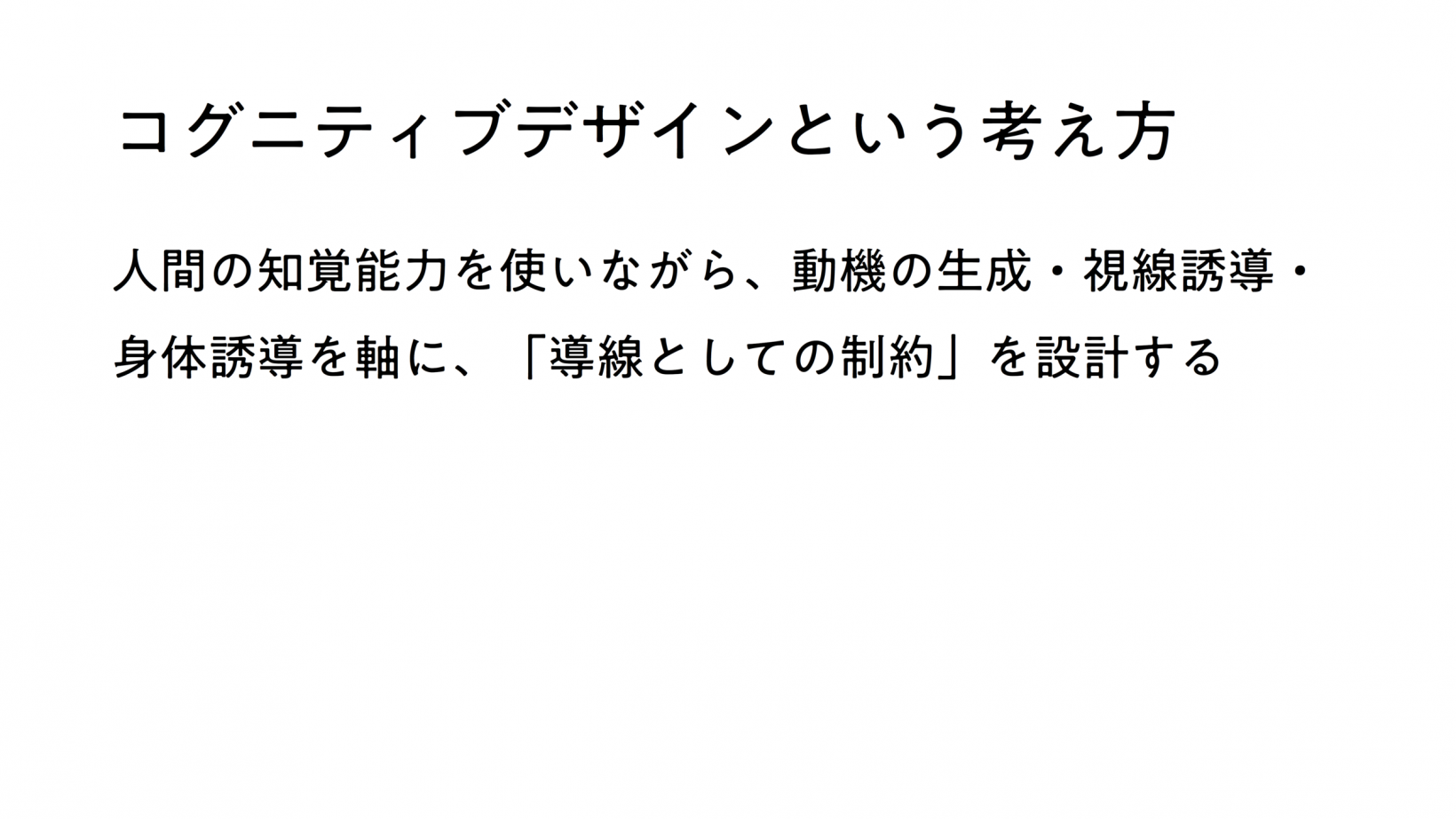 後半は、知覚を応した表現である「コグニティブデザイン」(直訳すると認知のデザイン)について、ご自身の研究事例をもとに紹介くださいました。 コグニティブデザインとは、人間の知覚能力を使いながら、動機の生成・視線誘導・身体誘導を軸に、「導線としての制約」を設計するデザインであると、菅さんは言います。 事前に制約を定めて人間の身体と行動を誘導するという、この考え方は、VRの作品づくりに大いに参考になるものでした。
