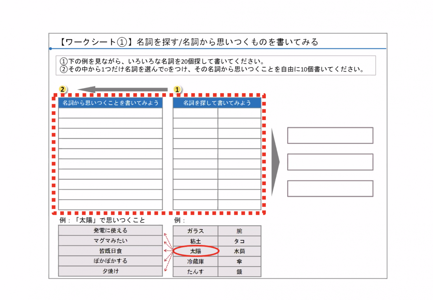 次に、いくつか挙げた名詞と連想した言葉を柔軟に組み合わせ、右の欄に書き出していきます。
