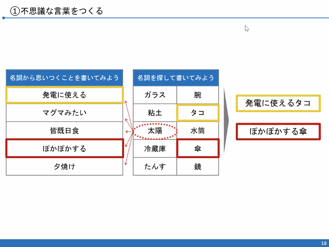 大まかな手順は3つで、まず「不思議な言葉」を作ります。その次に「不思議な言葉」から発想を膨らませていきます。そして最後に、想像したことを短い物語にまとめます。