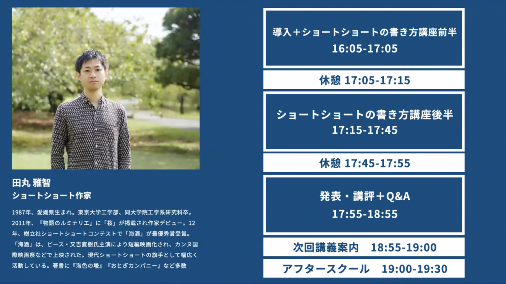 第3回目となる今回はショートショート作家の田丸雅智さんを講師にお招きし、物語の作り方について講義して頂きました。