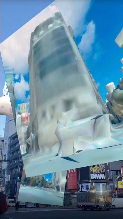 現実の渋谷にかつてその場所にあったという痕跡という形で同じ場所で撮られた写真が張り巡らされた都市AR作品。