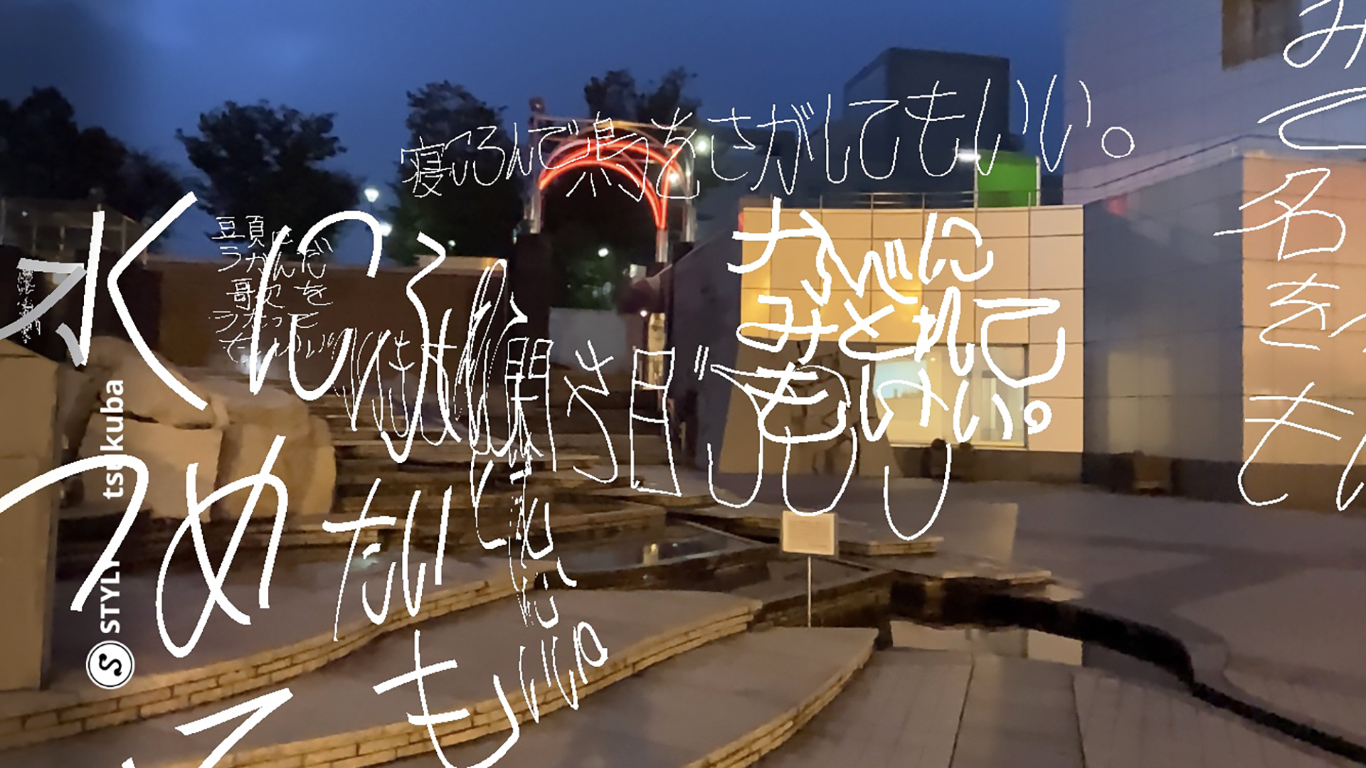 本作品是於今年 10 月在筑波市舉辦的戶外表演活動「HAM2022」的展出作品。原本設計的呈現方式是在車站前廣場,將上面寫有手寫字句的布條從高空作業車上以如同掛軸垂放的方式,由上往下滾展開來呈現。上頭書寫的文句取自於「長靴與星空」一書,此作是以居民的角度,敘述筑波於戰後作為研究學園都市進行開發的往事;亦引用了包含筑波中央大樓設計師磯崎新的話語等,與本地有著深厚關聯的人們的文字,意圖將現今的筑波風景書寫於上。但於8 月下旬,此計畫遭到行政單位喊停。據稱主要原因在於垂墜式的布條及手寫文字這樣的視覺元素,會讓人聯想到政治性活動(示威活動等)。因上述緣由,在街頭進行文字藝術的計畫無法進行,所以就想到可以利用VR 裝置書寫出透明文字的點子。而現在在筑波仍可看到這些文字。