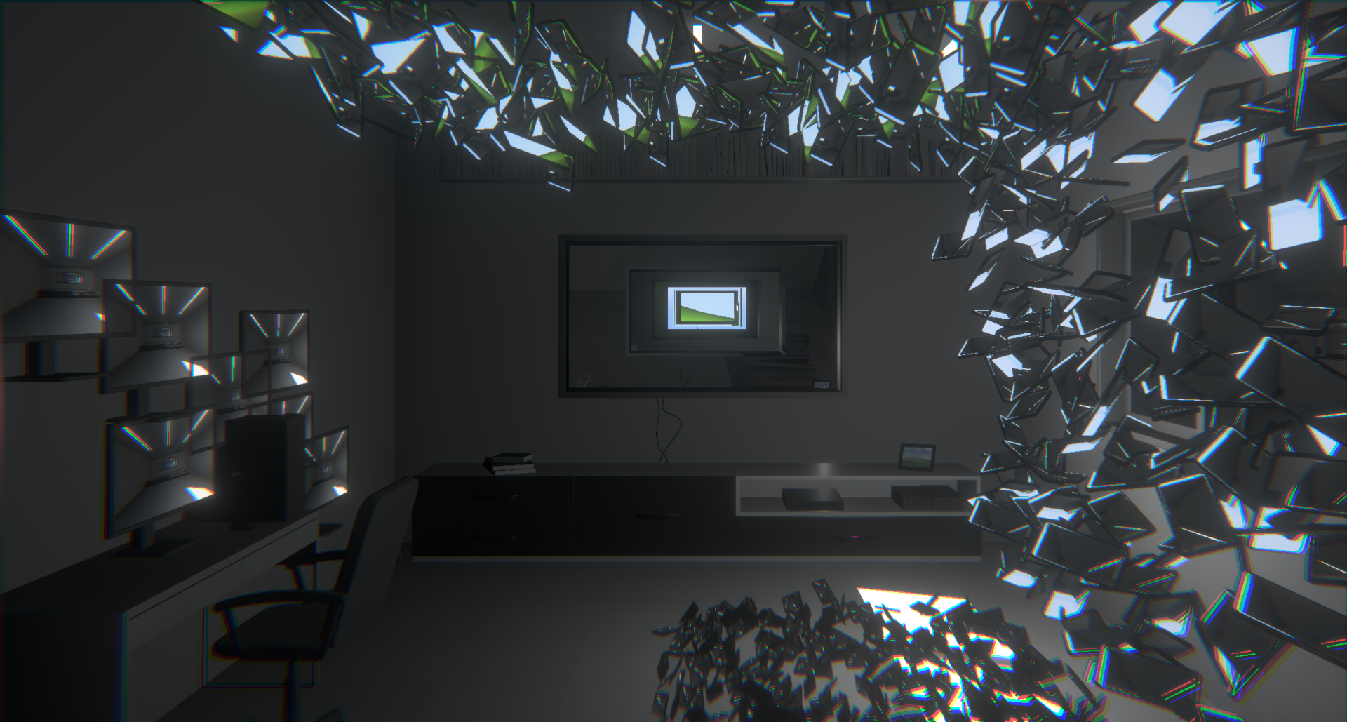 由於頭戴顯示裝置能夠幾乎完全遮蔽住使用者的視野,並且顯示出外表看起來很立體化的影像,所以能夠除去感覺方面的空間限制。相對來說,展現在一般顯示裝置上的影像都屬於平面影像,而尺寸、距離等方面通常也都會受到裝置本身所限制。本作品則是跨足兩種裝置的差異,刻意在VR世界裡處理顯示裝置這個主題,並且反過來利用這種符號特性嘗試各種實驗性的表現方式。將我們平常使用的顯示裝置變成可通往另外一個世界的窗戶,並藉此連接XR(Cross Reality)世界。雖然技術面上我們將感覺到的現實世界與非現實世界混合在一起,不過使用者窺視顯示裝置這道窗戶的行為本身並沒有改變。