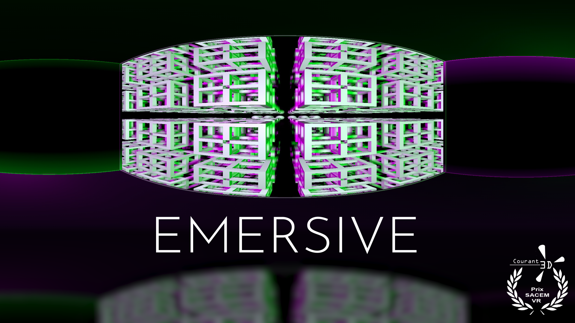 EMERSIVE 提供了 3D 復古未來風宇宙的 VR 迷幻體驗。這部影片是由單一鏡頭片段所組成,透過網格、低多邊形、碎形形式以及鮮豔色彩,對我們周遭的若干微觀世界空間進行探索,並為您帶來跨越邊界的體驗。如同動作編排,影片動態是以相機的運動為基礎:旋轉、下降、上升、前進、後退。配樂與音效檔案相結合,這場催眠之旅透過數位科技提醒我們科學發現與科技演進對社會的貢獻,從而改善我們的環境。這些片段採用 3D 形式在觀眾周圍循環播放,迫使觀眾改變自身的觀點、強迫他們積極參與並探索本作品,並擾亂觀眾的空間知覺。
