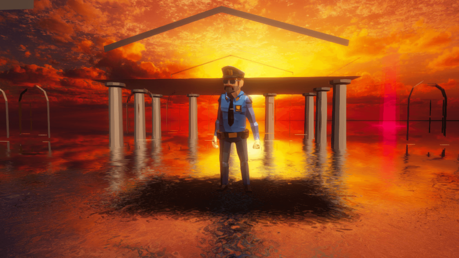 The work aims at defining the culture made in the virtual world as "Dystopia culture", and the experience of "Enthusiasm" that is created from Dysopia culture. It creates "Enthusiasm" by placing exciting items in various places, such as, people who feverishly continue to dance, signboards that flicker on and off, and displays that float in the air. Further, it expresses the feeling of Dystopia with things like crowds of police that swarm the air and sea, and announcers making appeals to safety that flow like background music. For we who live modern society full of fiction, I aimed to create a work that would give a kind of awareness.