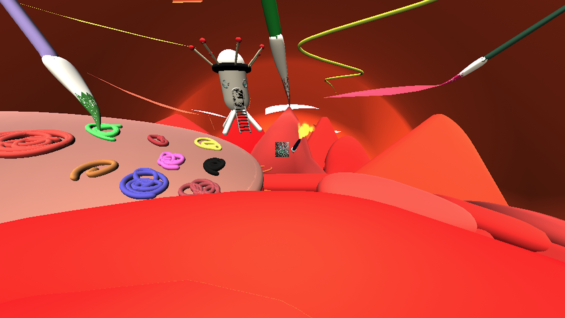 我一直都在畫畫。也就是說,我是一個畫家。往來於REAL工作室與VR工作室之間並不斷地繪畫,這讓我常常不自覺地思考一件事情。仔細想想畫家雖然在畫布這樣平面的2D空間上描繪世界,但其實腦袋中所描繪的世界卻是3D空間。這落差及隔絕感……到底是怎麼一回事呢?在個展與展覽會的會場裡,我常會聽到人們對我說,「我好想看看你腦袋裡裝了什麼東西」。時代的進步終於追上來了吧?好的,那就請大家來仔細看看我腦袋裡的東西吧。