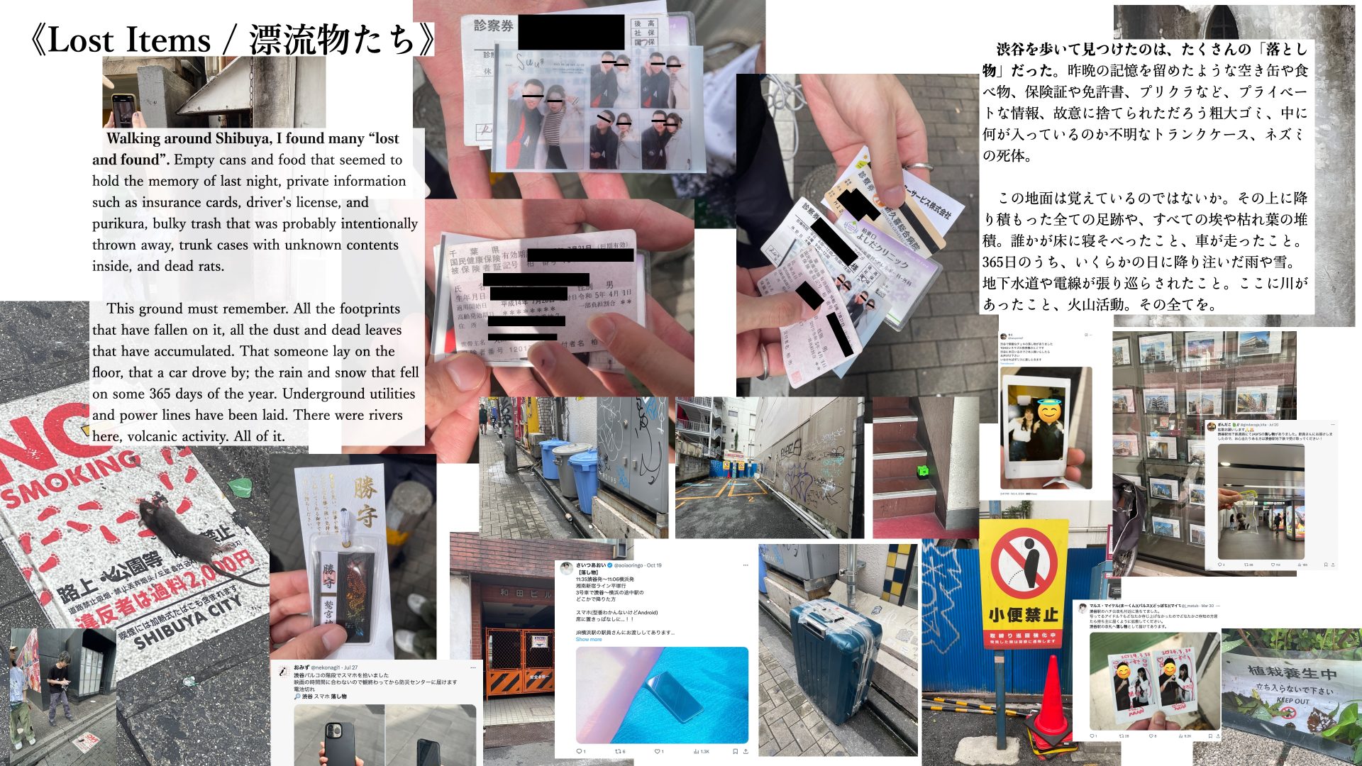 渋谷を歩いて見つけたのは、たくさんの「落とし物」だった。昨晩の記憶を留めたような空き缶や食べ物、保険証や免許書、プリクラなど、プライベートな情報、故意に捨てられただろう粗大ゴミ、中に何が入っているのか不明なトランクケース、ネズミの死体。