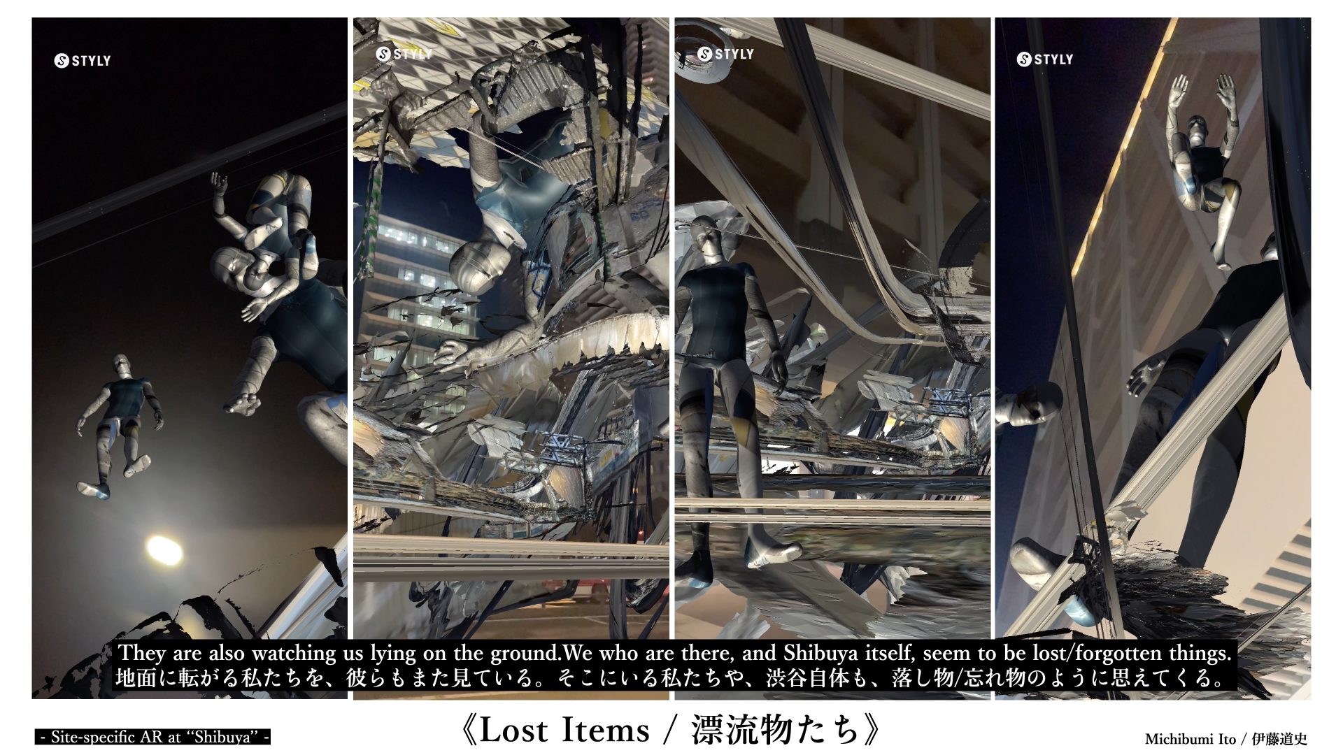 このARでは「落とし物たち」が、鑑賞者の上方や周囲に広がり、地面に転がる私たちを見下ろしている。地面に転がる私たちを、彼らもまた見ている。そこにいる私たちや、渋谷自体も、落し物/忘れ物のように思えてくる。