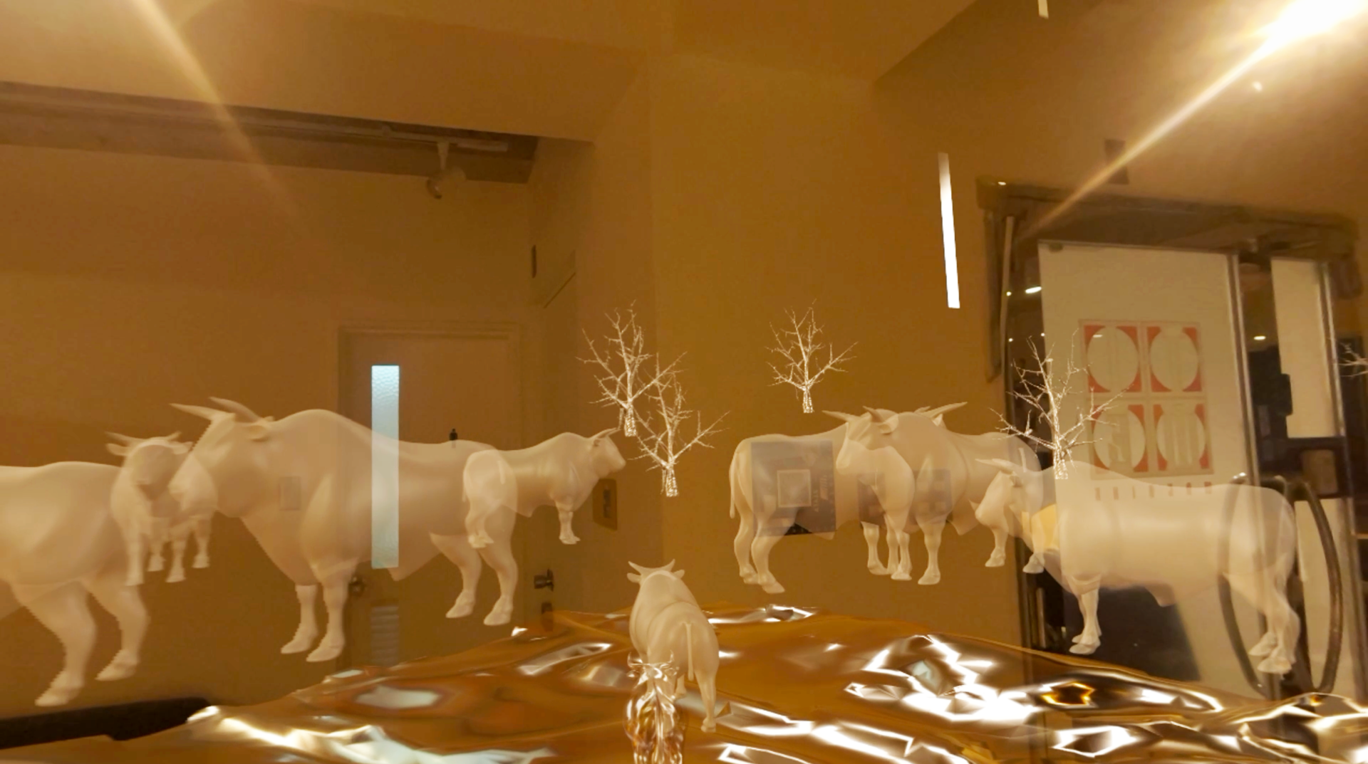 世界各地のあらゆる文明に存在した牛を神格化する信仰をインスピレーションにした本作は、時空の旅をして現代日本にたどり着いた様々な文明の牛の神々が、空間コンピューティングを通じて私たちの身の回りの風景に出現する様子を描く。