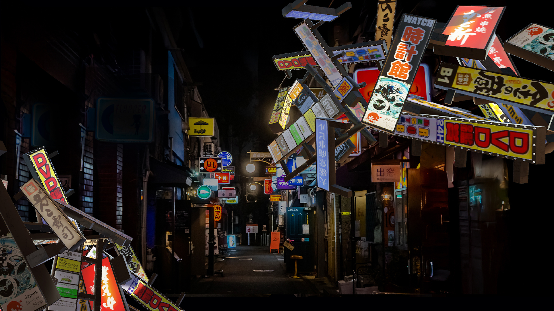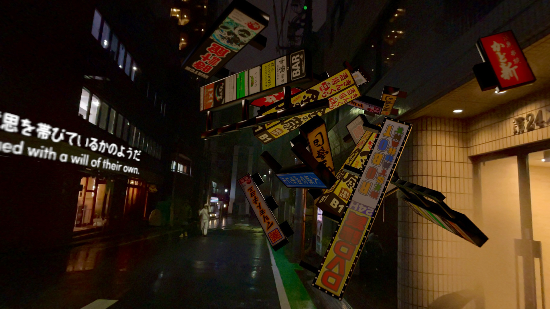 この作品は、Apple Vision Proのために制作されたインタラクティブな映像作品であり、没入型デジタルストーリーテリングの新たな可能性を切り開く試みです。新宿の鮮やかなネオン夜景を背景に、無機的な標識がまるで生き物のように再構築され、空間に浮遊しながら有機的で流動的な動きを見せます。この動的な振る舞いは、現代都市における情報の流れとその変容を象徴する視覚的寓話として機能します。