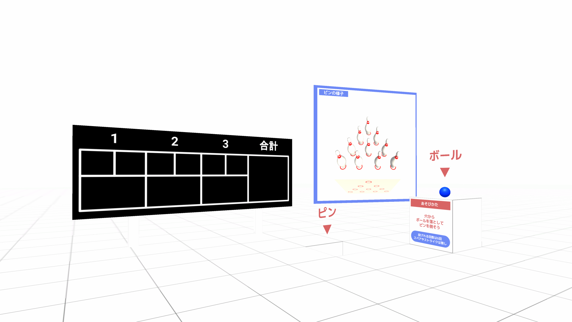 このゲームは通常のボーリングと異なり、穴からボールを落として下の方にあるピンを倒す「縦ボーリング」です。穴を覗き込んでボールを投げる新感覚ゲームとなっています。